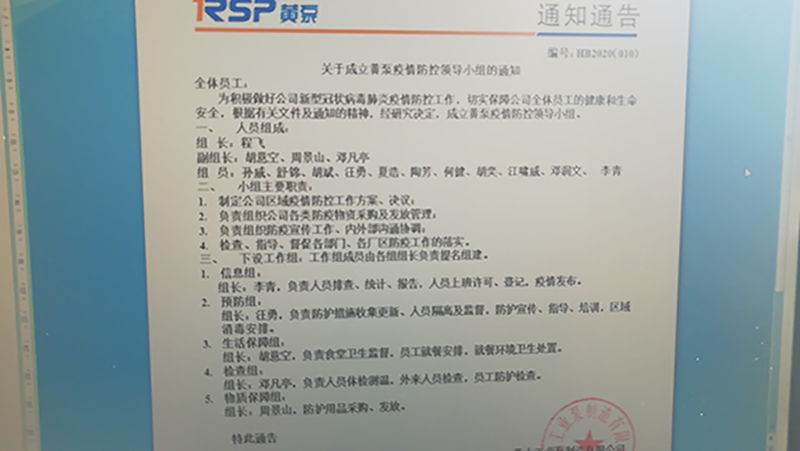 疫情防控是當(dāng)前最重要的任務(wù),而企業(yè)復(fù)工復(fù)產(chǎn),疫情防控是基礎(chǔ)和保障。黃泵公司于2020年2月4號(hào)企業(yè)復(fù)工復(fù)產(chǎn)前成立了疫情防控領(lǐng)導(dǎo)小組,由公司董事長(zhǎng)兼總經(jīng)理程飛擔(dān)任組長(zhǎng),公司副總胡意空、支部書(shū)記周景山和人力行政總監(jiān)兼支部委員鄧凡亭擔(dān)任副組長(zhǎng),并成立了五個(gè)專(zhuān)項(xiàng)小組:信息組、預(yù)防組、生活保障組、檢查組和物資保障組,確保企業(yè)復(fù)工后各項(xiàng)防控措施的落實(shí)。
